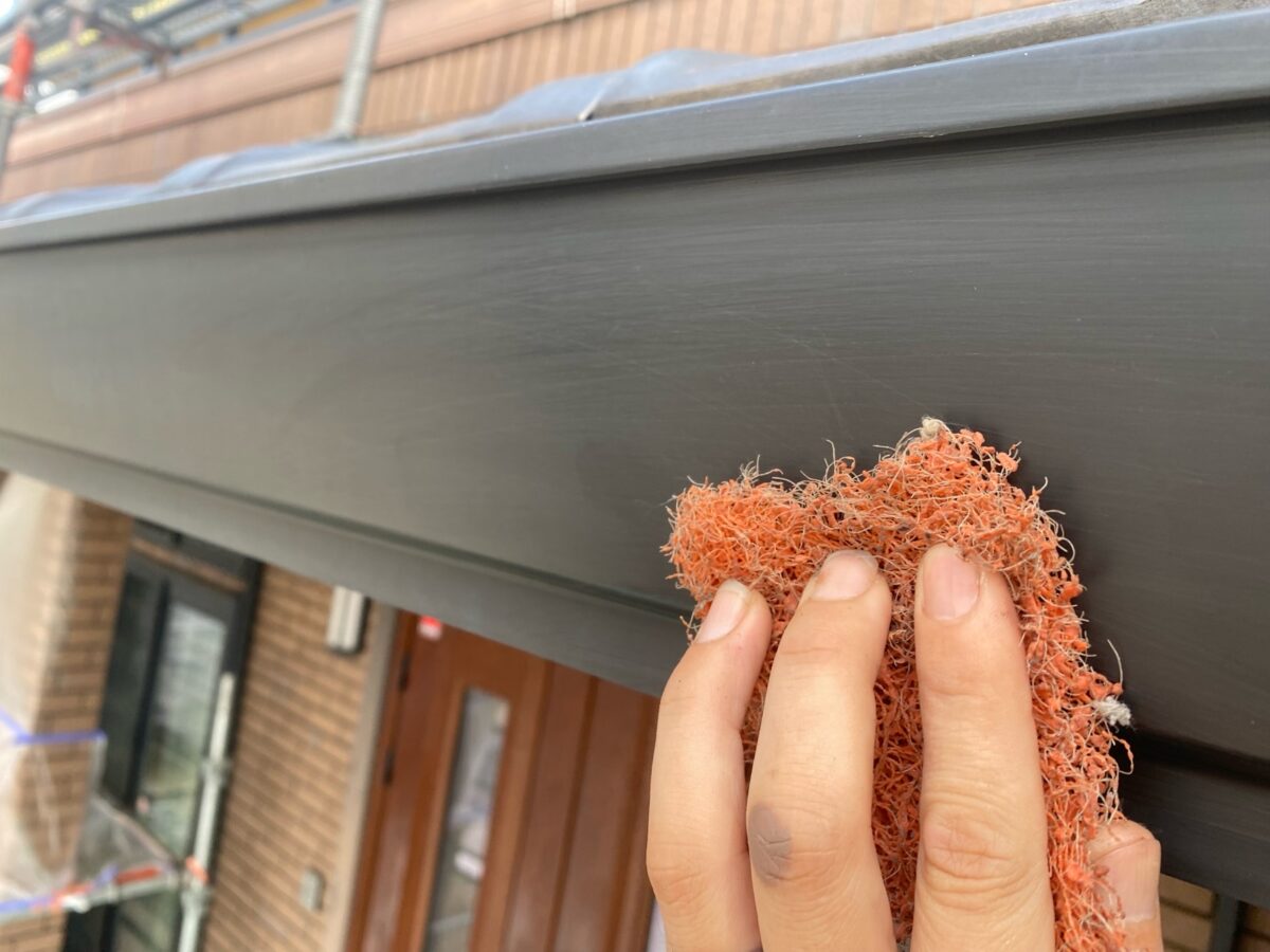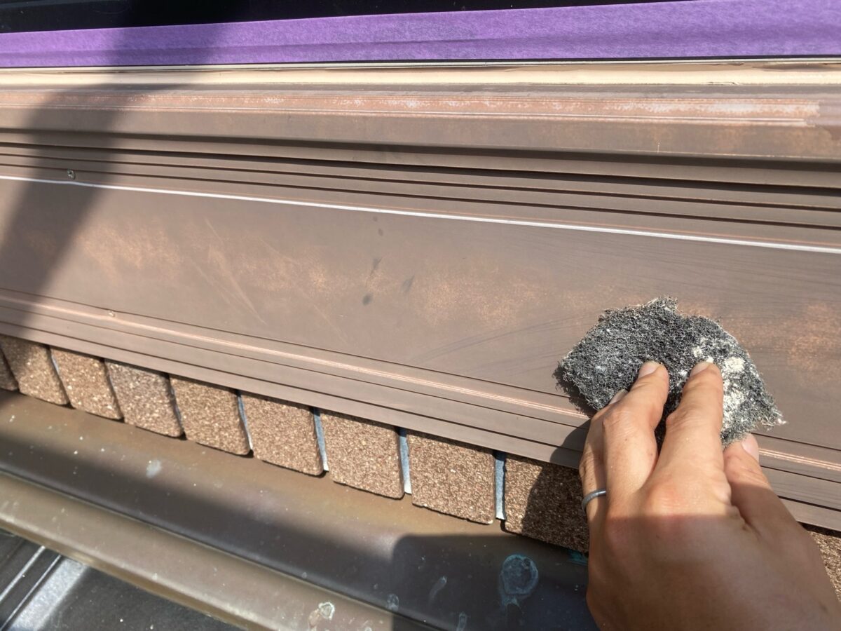 破損していた箇所を補修後、ケレン作業で表面を平らにしていくのと同時に軽く傷をつけていきます。そうすることで塗料の定着がしやすくなり、厚みと光沢のある美しい仕上がりに。「コーヒーブラウン」色です。