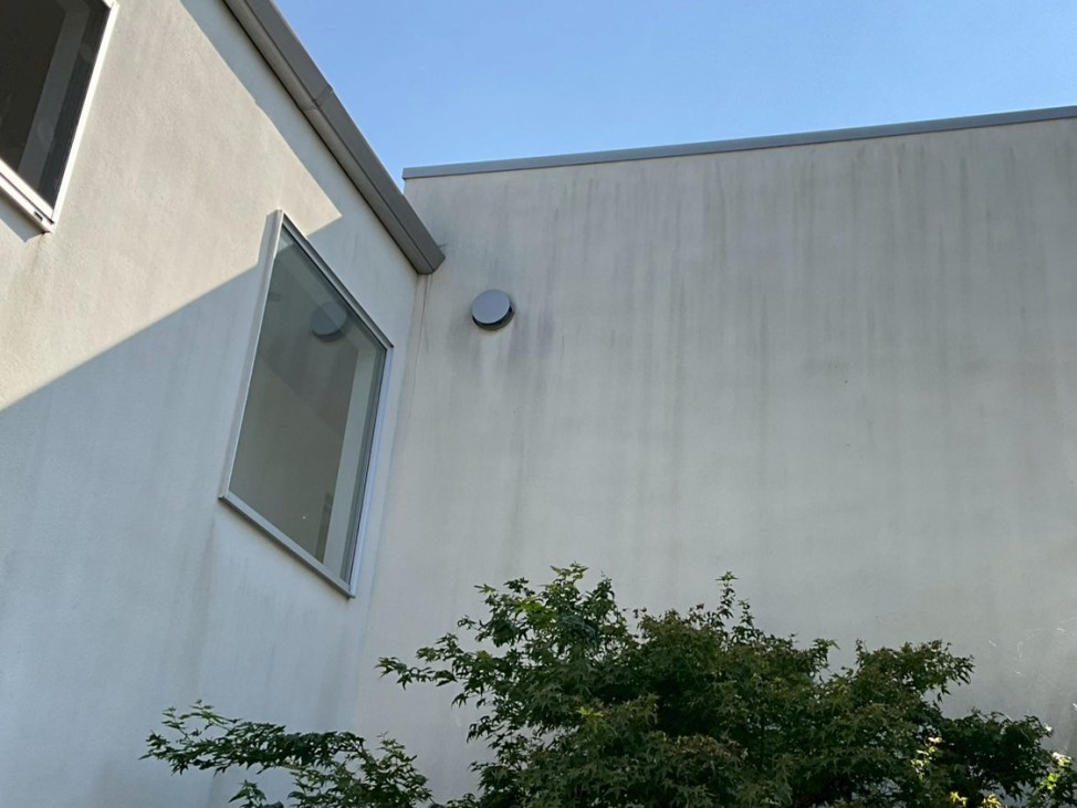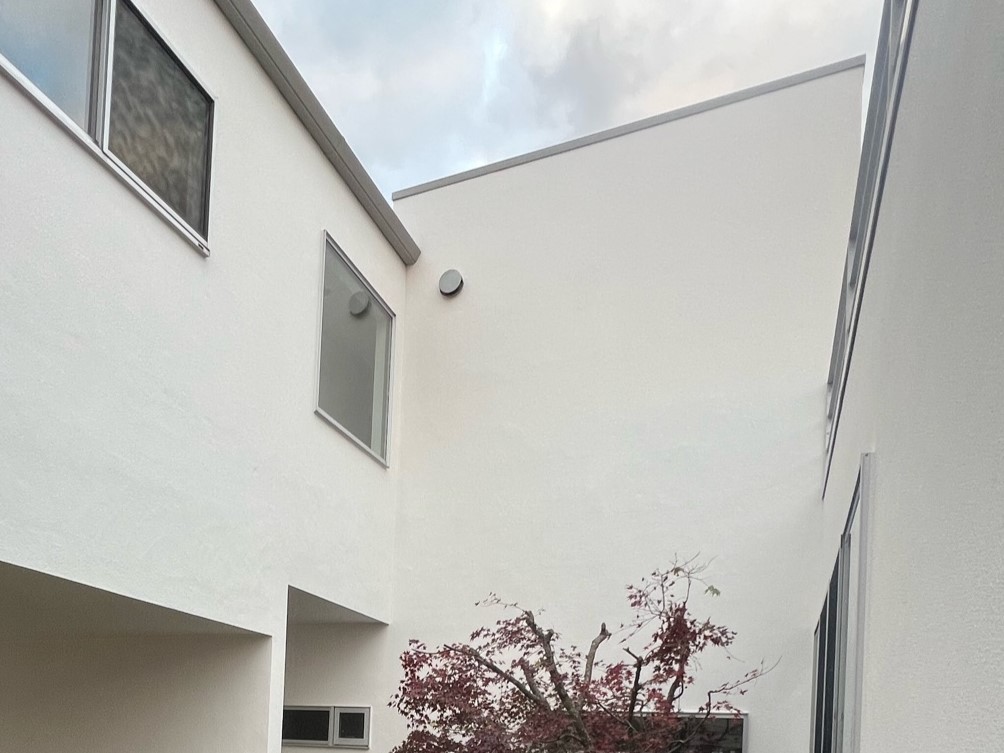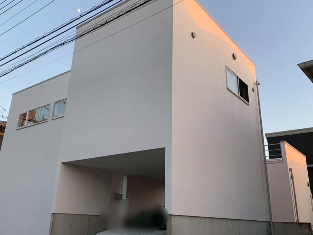 個性的で素敵な家のK様邸。既存と変わらないホワイト系「クールホワイト」の艶消しで塗装し、シャープに落ち着いた佇まいになりました。