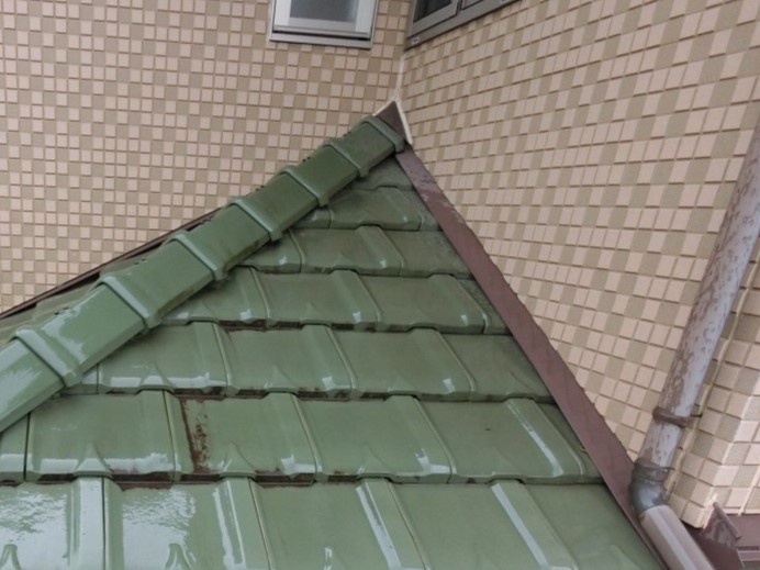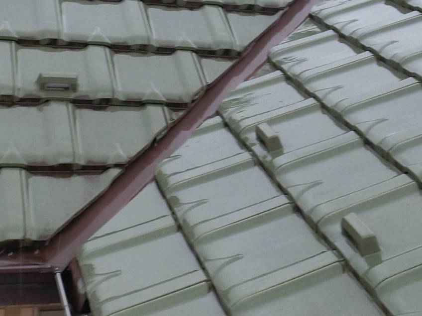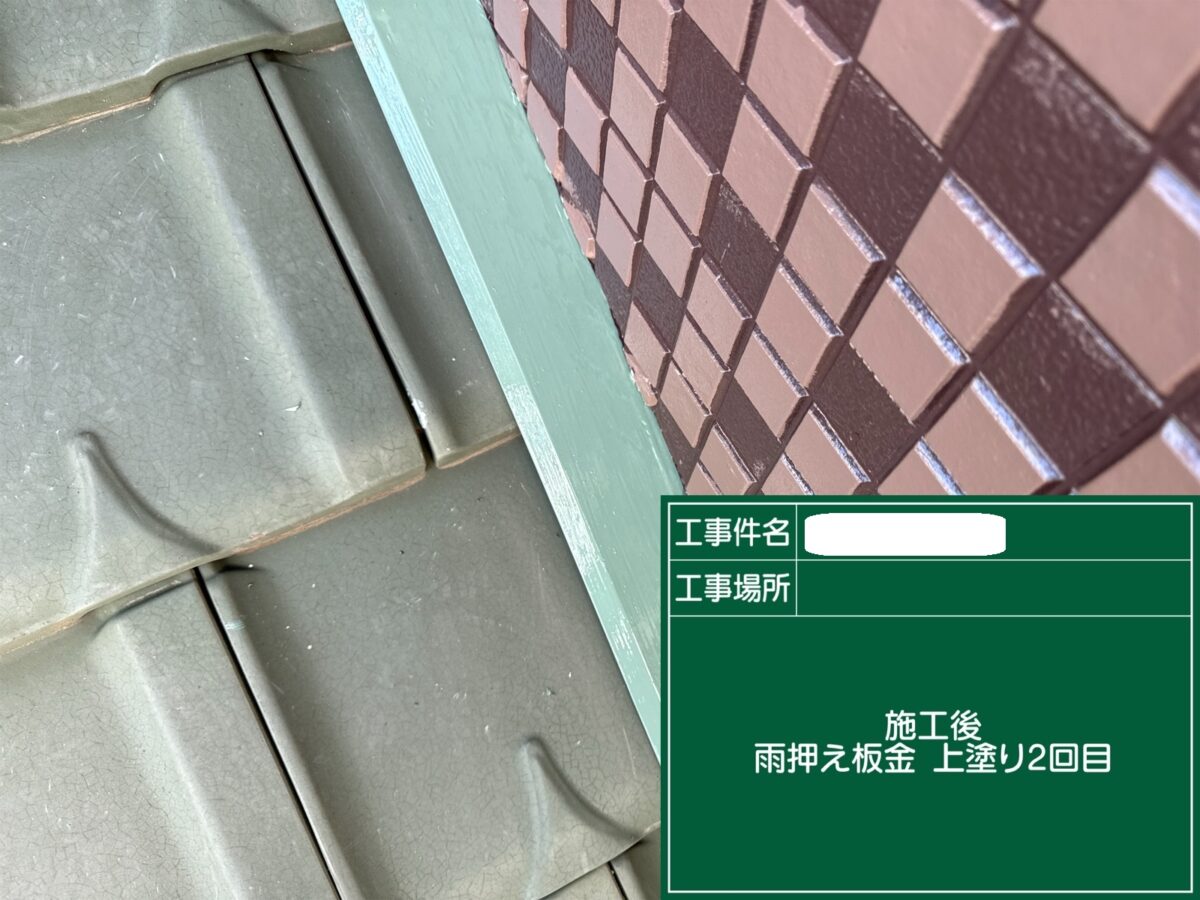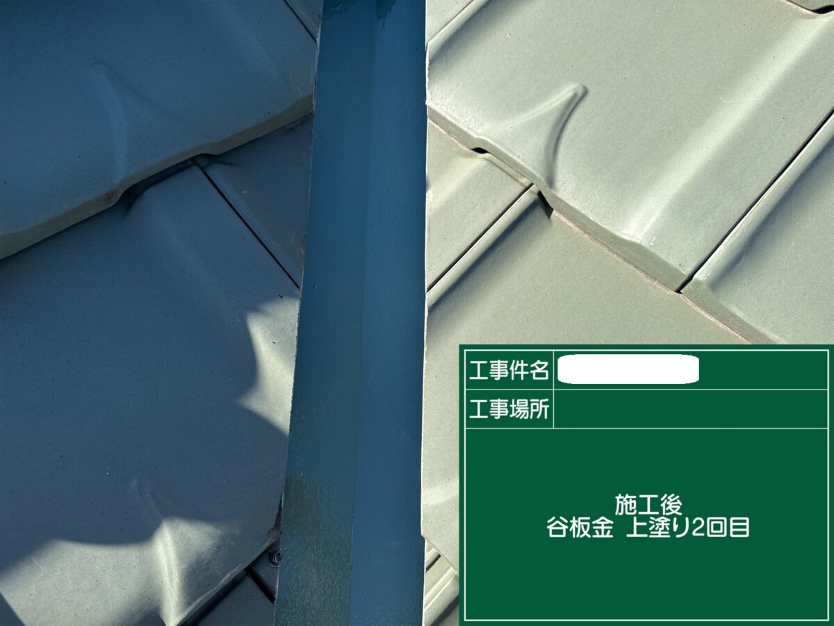 錆びやすい板金は錆止め材を下塗り後、屋根色に近い「リバーガム」で上塗りしました。屋根材(瓦)は塗装していません。