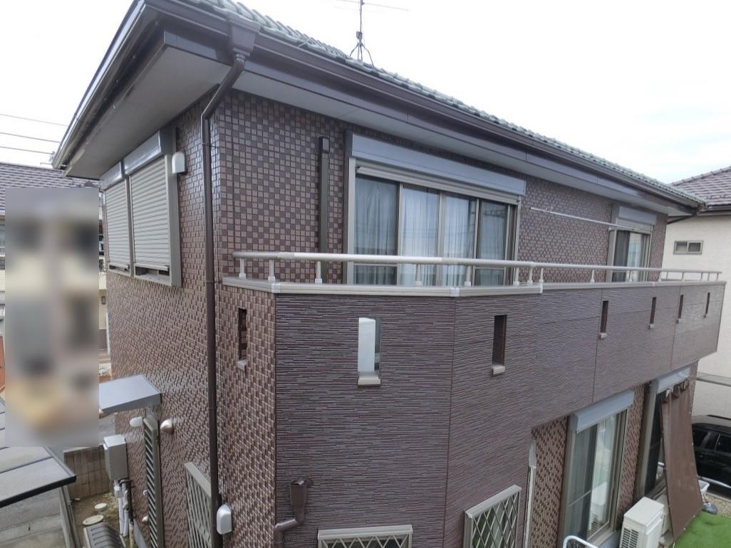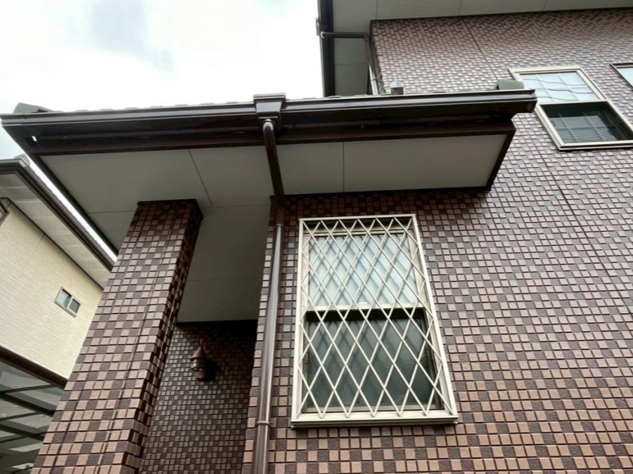 湿気がこもりやすく日差しも当たらない軒天は汚れも蓄積しやすく、艶消し塗料「パールグレイ」に。破風板と雨樋は外壁と同色「ヤララブラウン」にしたことですっきりとした見映えになりました。