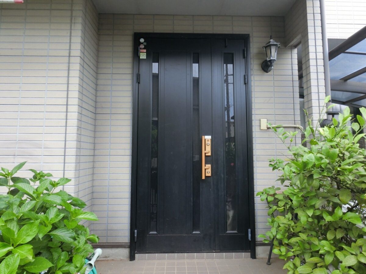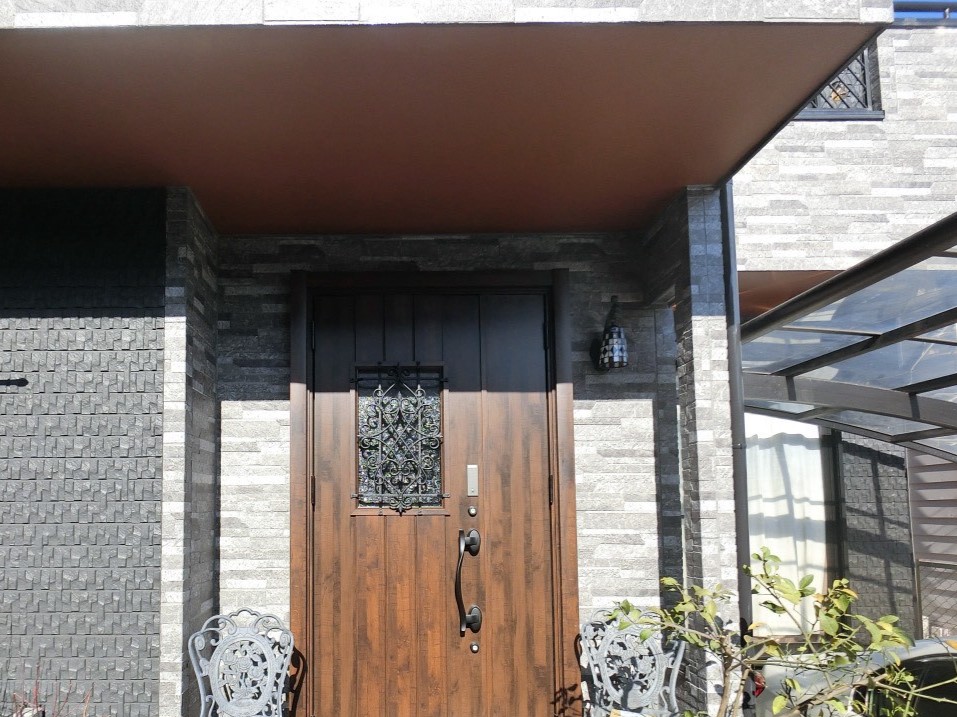 玄関ドアとライトも交換しました。軒天を玄関ドアに近い色「テラコッタ」に塗装したことで、玄関周りのグレーとの組み合わせも良く、温かみを感じます。