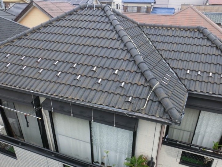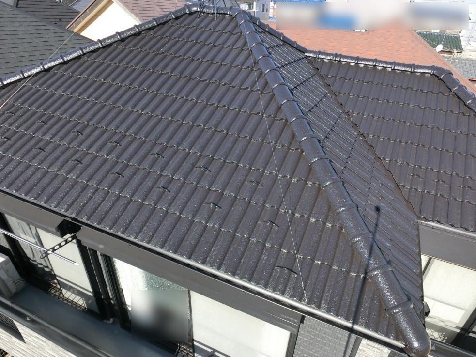 紫外線等による色あせや苔や汚れが付着していた屋根は、ひび割れ・キズに強く、建物を永く守る無機ハイブリッドコートの「アイボリーブラック」で塗装しました。艶々です!
