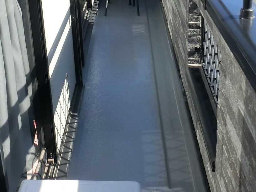 トップコート工法のベランダ防水塗装(グレー)、破風板・鼻隠し・竪樋・雨戸・戸袋は塗装した外壁色と同色ですっきりと。※横樋は交換しました