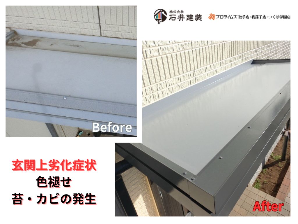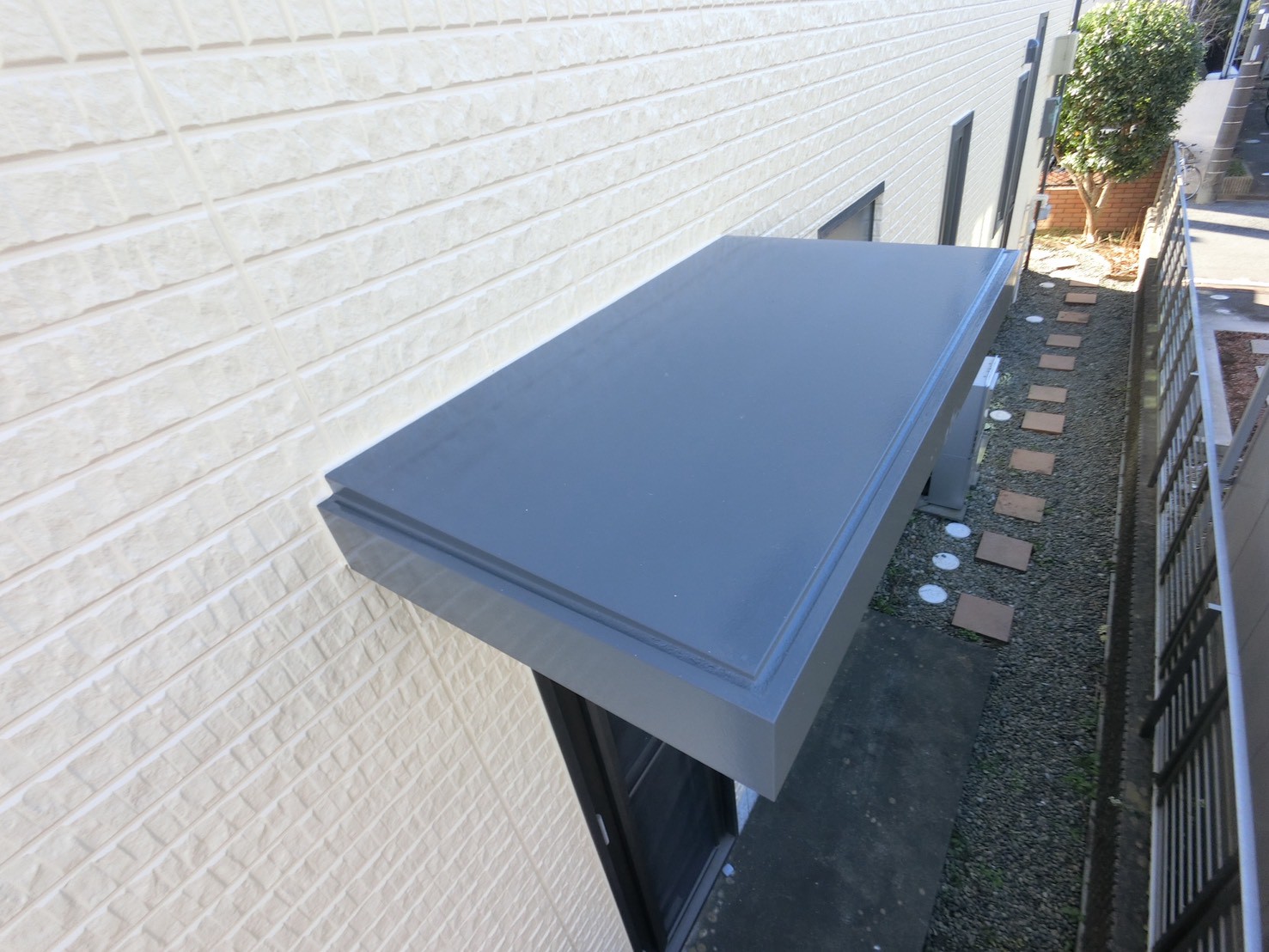 樋は色褪せていましたが、「スレートグレー」色に塗装し艶々に。耐候性・低汚染性・高作業性・防カビ・防藻性の機能の付いたシリコン塗料を使用しました。