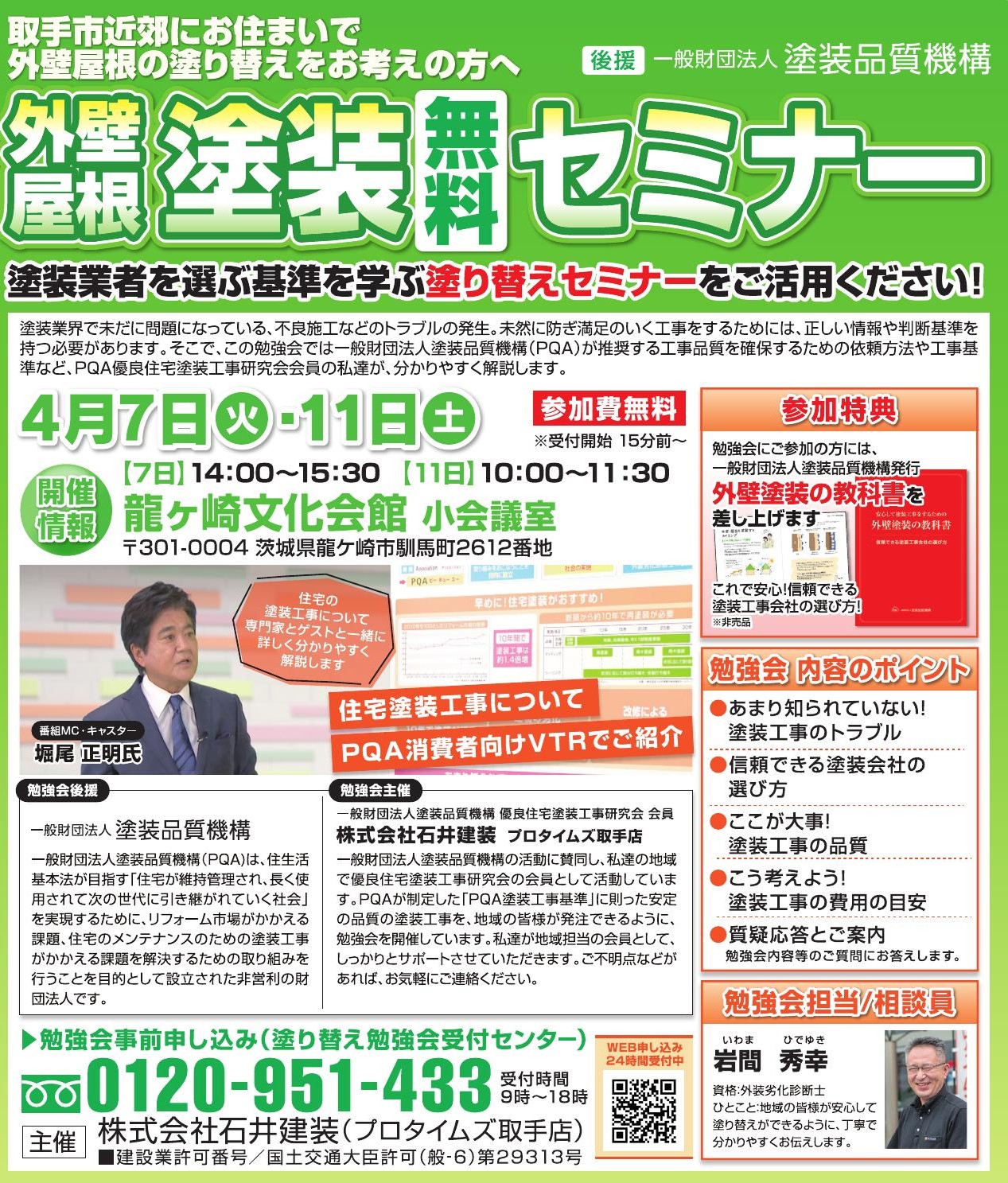【龍ケ崎文化会館】屋根・外壁塗装無料セミナー(勉強会)を開催します。