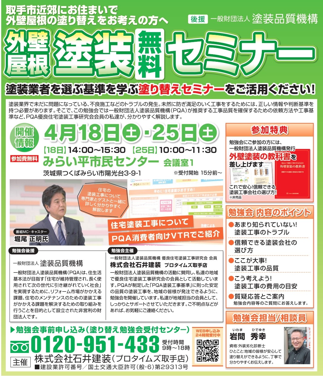 【みらい平市民センター】屋根・外壁塗装無料セミナー(勉強会)を開催します。