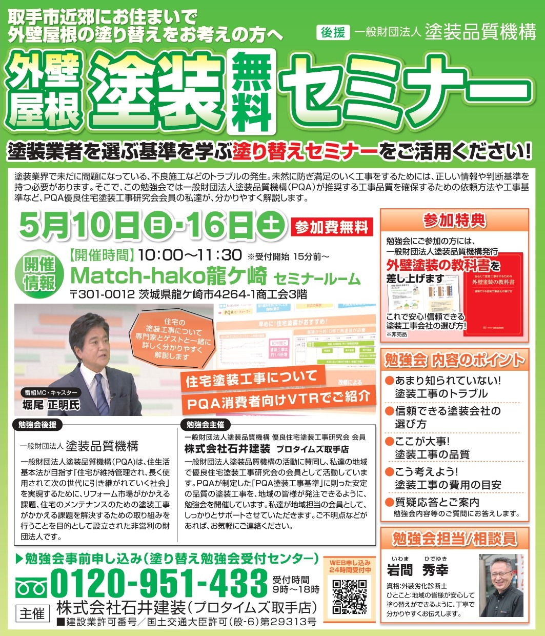 【Match-hako龍ケ崎・5/10㊐】屋根・外壁塗装無料セミナー(勉強会)を開催します。