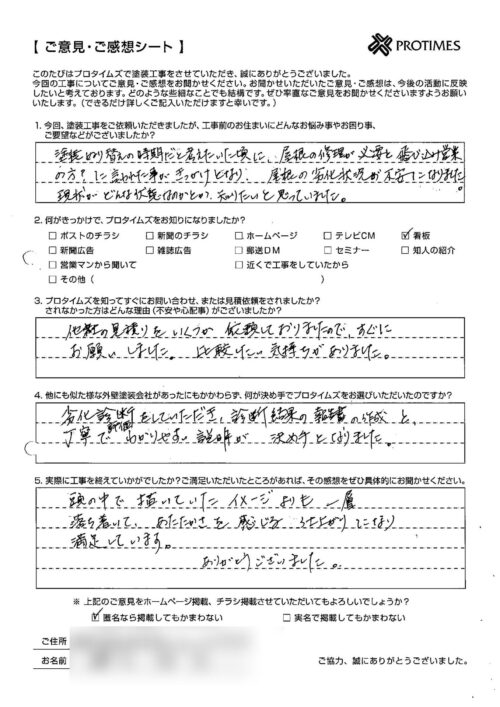 まず、業者選択のための見積依頼⇒その後のしつこい営業とか嫌だなあと思っていましたが、プロタイムズさんはそのような事はなく、ゆっくり考えてから決めることができました。安い買い物ではないので工事内容をできるだけきちんと理解したいと思っていましたが、写真やデータを使って、わかりやすく説明していただきありがたかったです。