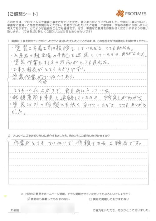 これから塗り替えを予定している近所や知人にも自信をもっておすすめできる会社です。