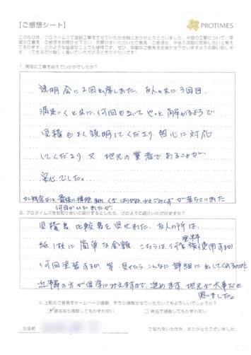 満足いくと共に、何回もきいてやっと解るようで見積もよく説明してくださり、熱心に対応してくださり、又、地元の業者であることが安心でした。