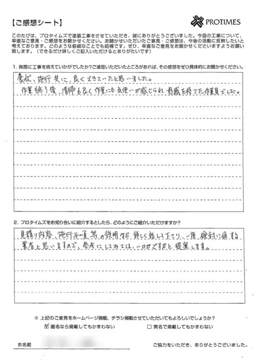 職人の仕事ぶりをお褒めいただき大変嬉しく存じます!今後も社員一丸となって丁寧な仕事で皆様にご満足いただけるよう励んでいきたいと思います。