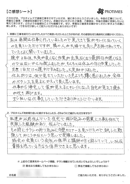 途中3日位天気が良くなく作業が出来なくなり最終日が遅くなるのではないかと心配しましたが、もともとは休みの日に作業していただき、一日だけの遅れですみました。大変助かりました。
