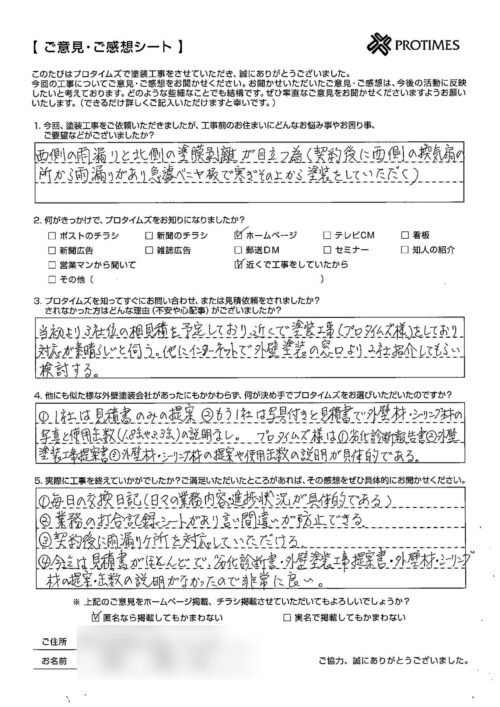 ④今迄は見積書がほとんどで、劣化診断書・外壁塗装工事提案書・外壁材・シーリング材の提案・缶数の説明がなかったので非常に良い。